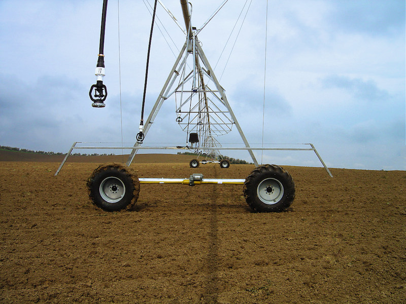El carro va montado sobre dos o cuatro ruedas motrices y se alimenta por medio de una manguera que se conecta a uno o varios hidrates, en función de las dimensiones de la parcela y del caudal a aportar, o bien mediante un grupo de bombeo incorporado al propio carro central, que aspira directamente de canal para la alimentación del sistema.